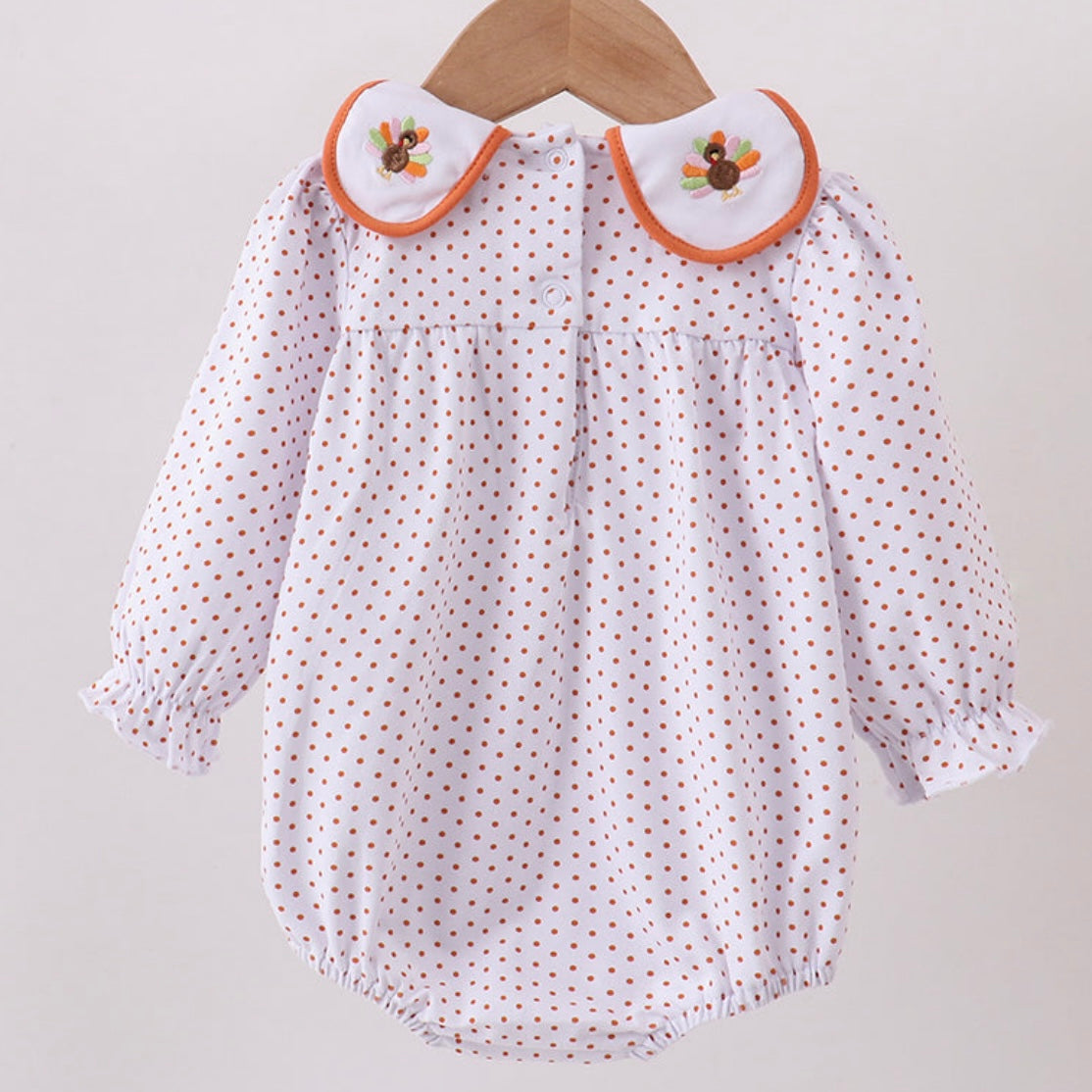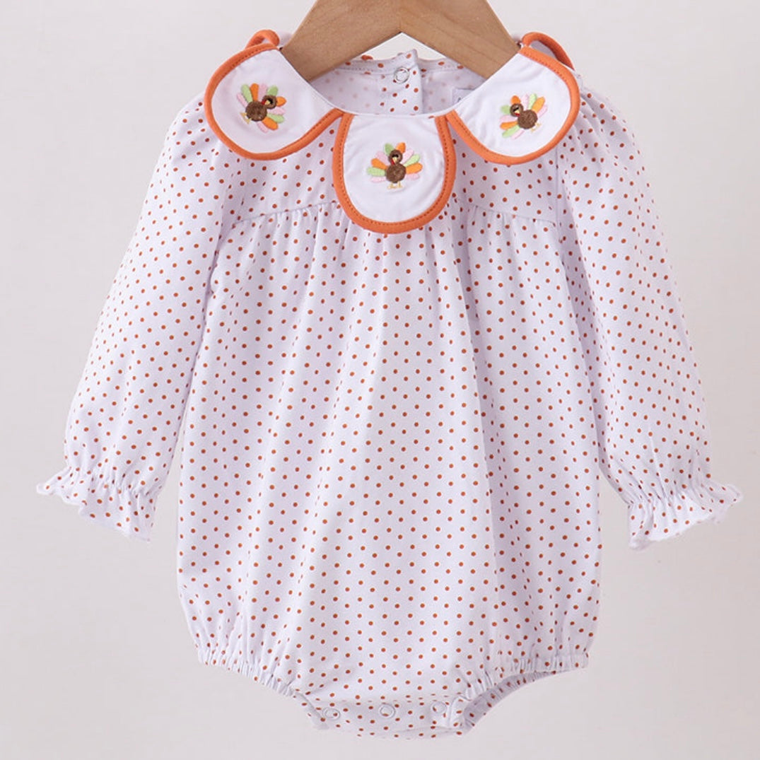 Your little one will be cute as can be in our Feathered Friends Bubble! This darling outfit features a crisp white fabric sprinkled with playful polka dots and a scalloped collar delicately embroidered with cheerful turkeys. Perfect for fall festivities and Thanksgiving gatherings, this bubble blends timeless charm with a touch of holiday fun. Soft, comfy, and picture-perfect—your tiny turkey will be ready to celebrate in style!
