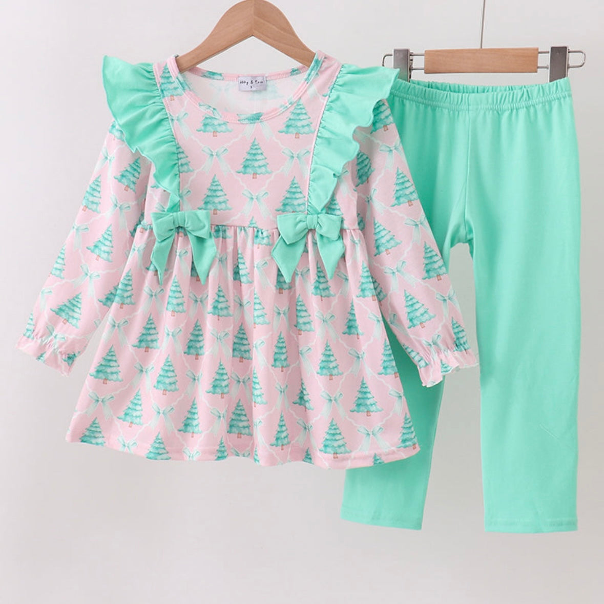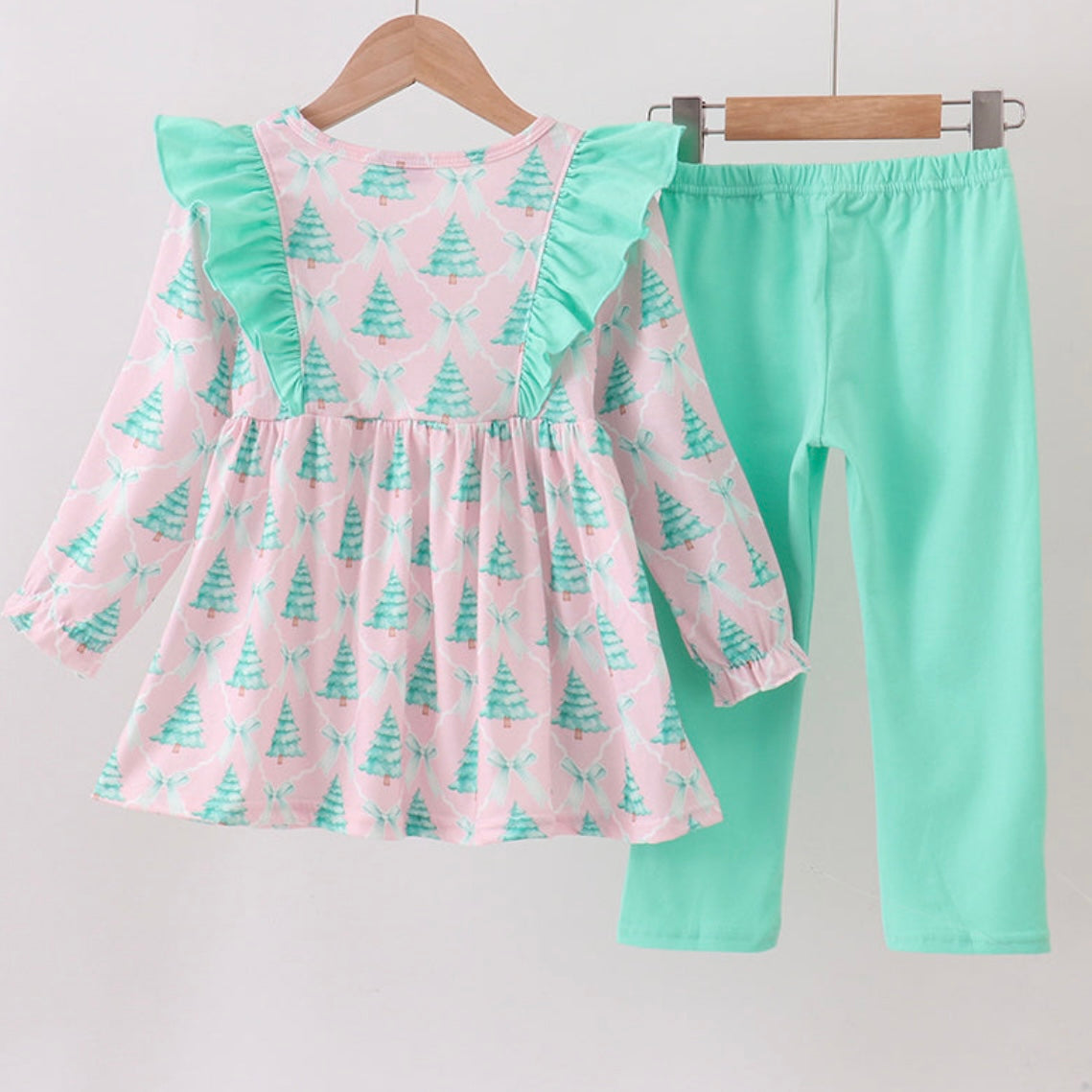 Make her holiday extra merry in our Under the Mistlebow Set! This sweet two-piece features a pink top covered in playful Christmas trees, complete with mint ruffles and bows — perfectly paired with coordinating mint pants for the cutest festive look.